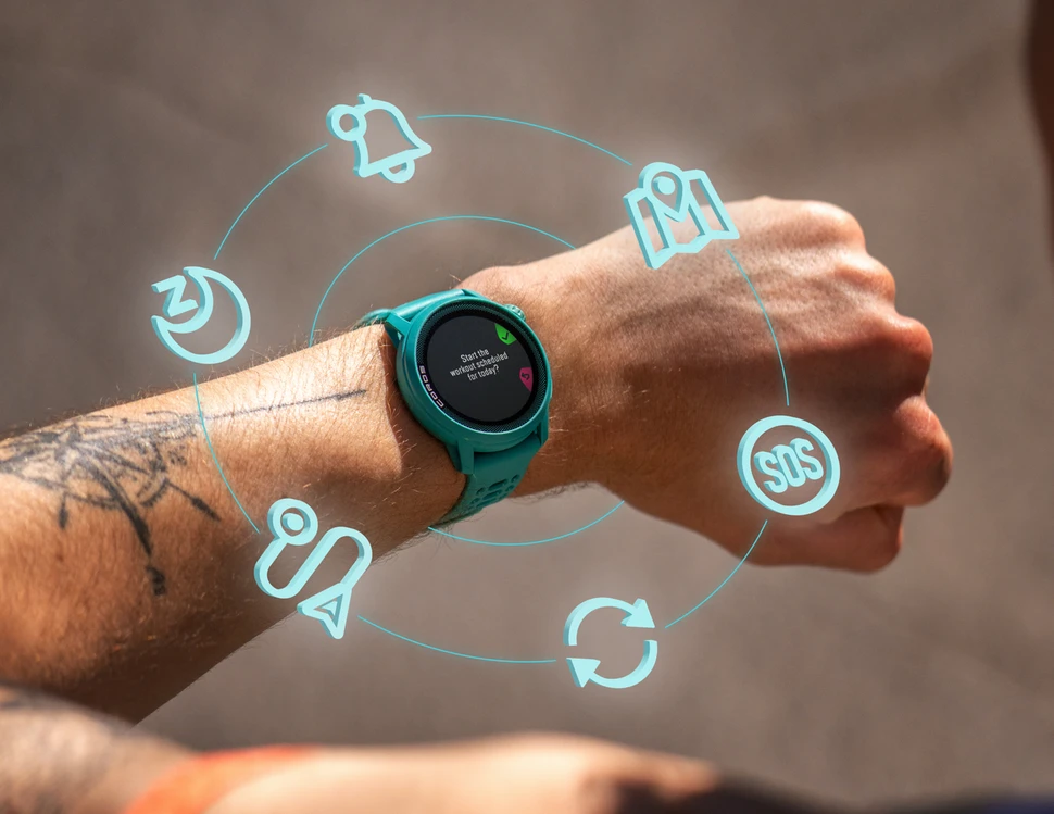 Gestiona fácilmente tus necesidades de horarios con un cronómetro, temporizador y alarma directamente en tu reloj que se pueden configurar en un instante. Accede a cada una de estas herramientas a través del menú de herramientas manteniendo pulsado el botón 'atrás' (inferior) de la esfera principal del reloj o durante los entrenamientos. La función de alarma destaca por la posibilidad de configurar tu reloj para que sólo vibre, de modo que puedas despertarte sin molestar a tu pareja. Personaliza los ajustes de vibración y tono en la aplicación para adaptarlos a tus preferencias.