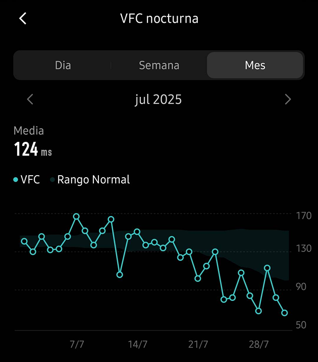 La VFC muestra una tendencia a la baja en la app. Vale la pena prestar atención a las tendencias que se encuentran por debajo de tu rango normal.