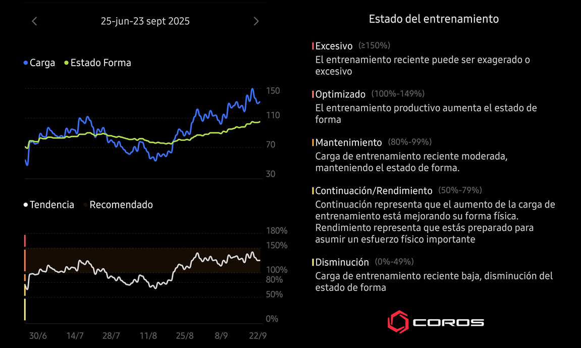 Esta métrica es la cantidad de entrenamiento que realizas en un período intenso (impacto de carga) en comparación con la cantidad de entrenamiento a la que estás acostumbrado (estado de forma base). Es una forma excelente de comparar tu entrenamiento actual con tu entrenamiento habitual. Cuando el impacto de carga aumenta demasiado rápido en comparación con tu estado de forma, aumenta el riesgo de lesiones y agotamiento.