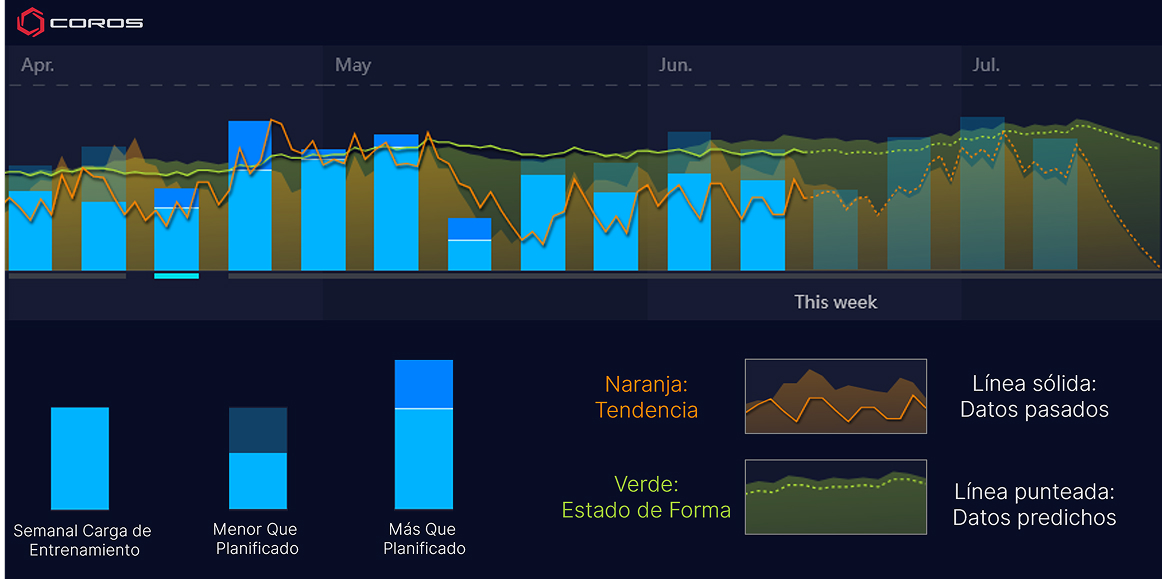 Alcanzable: Para mantenerte fiel a tu objetivo, este debe ser alcanzable. Si trabajas 40 horas a la semana, es probable que montar en bicicleta durante 3 horas al día sea más de lo que puedes comprometerte. Si empiezas poco a poco y alcanzas el objetivo, es más probable que lo amplíes en el futuro en lugar de rendirte antes de haber empezado realmente. COROS te lo pone más fácil al estimar tu estado físico actual y proporcionarte la carga de entrenamiento óptima. Úsalo para ver en qué punto del camino te encuentras y decidir hasta dónde puedes llegar.